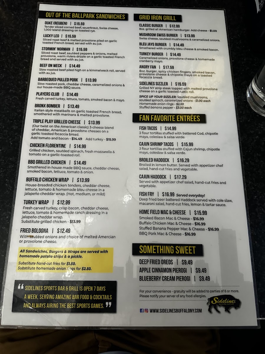 Introducing the menu at Sidelines Sports Bar and Grill is a celebration of classic flavors with a bold twist. Located in the heart of Buffalo, NY, this vibrant sports bar invites guests to indulge in a lineup that starts with irresistible Pretzel Stix paired with house-made queso, and Mozzarella Stix served with sweet basil marinara. For those craving something heartier, the Fish Fry features fresh, beer-battered haddock, while Cajun Shrimp Tacos bring a spicy kick to your meal.